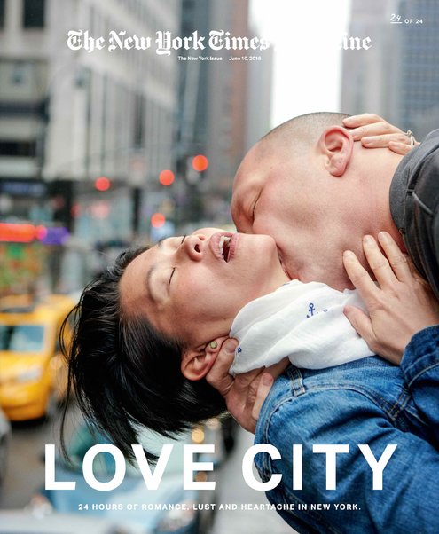 Обратите внимание, что каждый снимок в серии «24 поцелуя за 24 часа» стал обложкой The New York Times. Обложки были распределены между подписчиками и газетными киосками произвольным образом, чтобы «поцелуи» охватили весь город.