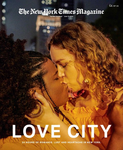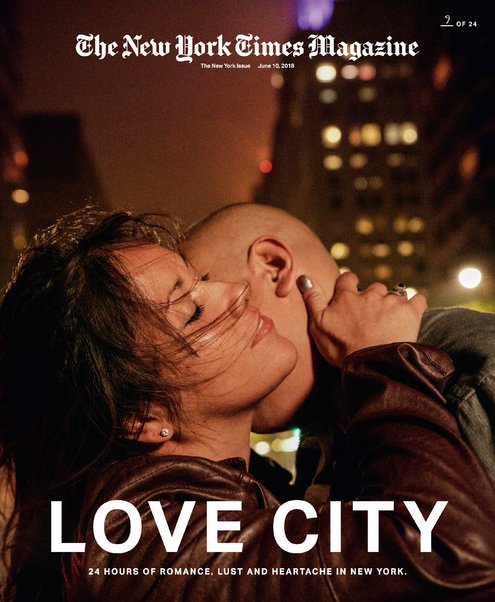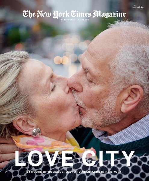 Обратите внимание, что каждый снимок в серии «24 поцелуя за 24 часа» стал обложкой The New York Times. Обложки были распределены между подписчиками и газетными киосками произвольным образом, чтобы «поцелуи» охватили весь город.