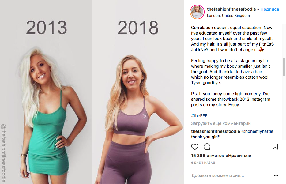 Девушка выложила коллаж с двумя фотографиями: одну она сделала в 2018 году, а другую — пять лет назад. В описании Люси рассказала о своем образе жизни в прошлом и отметила, что красивая фигура не гарантия хорошего здоровья и разумного похудения.