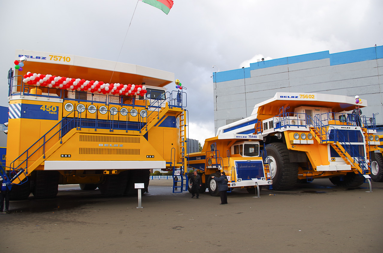 Часть передней подвески с тормозами. Вон то большое сзади — это часть заднего моста. БелАЗы грузоподъемностью выше ста тонн оснащаются электротрансмиссией. Мотор-колеса крепятся к этой «бочке», посередине размещаются тормоза, крепящиеся к валам электродвигателей. Чуть ниже можно будет увидеть с другого ракурса люк для доступа к системе торможения. Если приглядеться, то можно обратить внимание, что на конвейере одновременно собирается несколько разных моделей. К сожалению, я не знаю всех особенностей, поэтому не могу на сто процентов сказать, какая модель в итоге выйдет. Вот это, судя по креплениям воздушных фильтров, в итоге будет 220-тонником. А вот здесь установлен дизельный двигатель Cummins. Установлены мотор-колеса, ведется монтаж электросхем. Отверстие сзади с лесенкой нужно для обслуживания тормозной системы заднего моста. Тормоза находятся именно там. Топливный бак, установленный за колесом, примерно на 1,7 тонны топлива. В конце сборки устанавливаются колеса, и самосвал готов своим ходом покинуть ворота цеха. Готовый красавец грузоподъемностью 220 тонн, готовый к выезду из цеха. На улице +5, моросит противный дождь, а оделся я довольно легко для такой погоды. В цехах тепло, но уже, к сожалению, все просмотрено и отснято. Впрочем, нам не привыкать, айда на улицу! Еще несколько БелАЗов притаились в кустах. Без кузова он даже кажется небольшим 🙂 Только колесико выше моего роста (1,86 м). Народу, несмотря на плохую погоду, было много. Родители приехали со своими детьми, были даже малыши в колясках. На площадке между цехов и самосвалов была установлена сцена и проходил концерт какой-то местной самодеятельности. 360 + 40 + 450 = 850. Это не арифметика, это общая грузоподъемность этой троицы. БелАЗы на подбор. Вам какой? Готовые БелАЗы у цеха. Мотор-колесо. А теперь немного спецтехники, выпускаемой БелАЗом и входящим в холдинг БелАЗ Могилевским автомобильным заводом. Этот пепелац служит для увлажнения дорог в карьерах, чтобы снизить запыленность. Самосвал-землевоз МоАЗ-75041 грузоподъемностью 27 тонн. Эвакуатор для вышедших из строя БелАЗов. Шахтный автопогрузчик. Используется для работы в шахтах, поэтому кабина ему не нужна. Еще один могилевский самосвал, к сожалению, точную модель затрудняюсь указать. БелАЗ-75180 грузоподъемностью 180 тонн и мощностью 2000 лошадиных сил. БелАЗ-75174 грузоподъемность 150 тонн. БелАЗ-75302 грузоподъемностью 220 тонн. Мама, папа и сынок. Округлый. Также благодаря новой форме снижена собственная масса этой самосвальной платформы. БелАЗ-74212 — аэродромный тягач. Обратите внимание — кузова практически всех БелАЗов разборные. Это нужно для того, чтобы уложиться в железнодорожный габарит. Не влезать — злой дятел! Как я писал ранее — в этом дупле находится тормозная система. БелАЗ-75602 грузоподъемностью 360 тонн. По сравнению со своими собратьями этот совсем малыш! Ну а теперь на сцену выходит он — БелАЗ-75710. Полный привод, два дизельных двигателя MTU DD16 V4000 общей мощностью 4600 лошадиных сил. Без загрузки работает один двигатель, при полной — второй автоматически включается в работу. Два топливных бака вмещают 5600 литров топлива, гидросистема рулевого управления и подъема кузова содержит 1800 литров гидравлической жидкости. Собственный вес около 400 тонн.