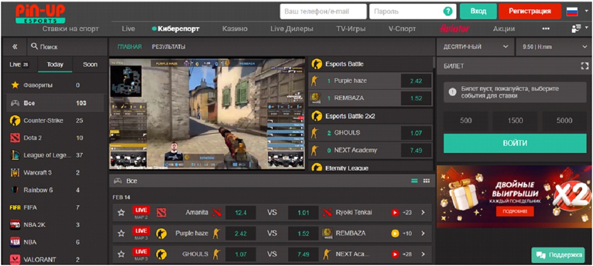 Раздел Киберспорт в Пин Ап сделан очень качественно. Во-первых, он очень стильный. Во-вторых, он очень удобный, понятный, и в то же время, информативный. В верхней части центральной колонки идет трансляция одного из текущих матчей. Любой желающий может посмотреть, как играют лучшие киберспортсмены мира.