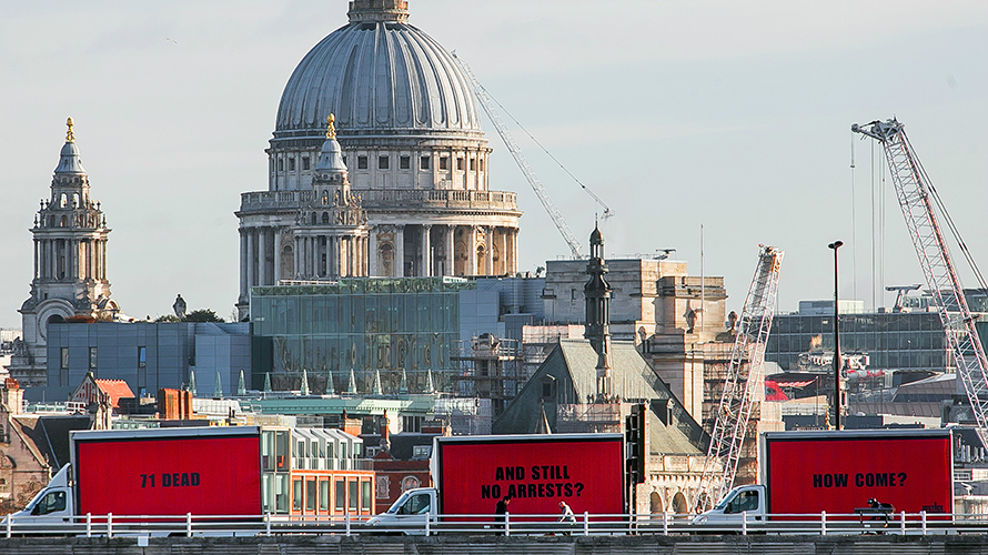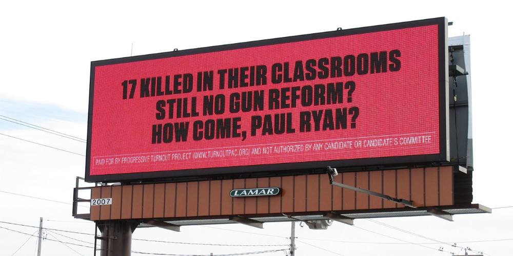 В картине Мартина Макдоны главная героиня решила привлечь внимание к расследованию убийства своей дочери и арендовала три билборда у въезда в город, на которых распорядилась вывесить надписи: «Была изнасилована, пока умирала», «Никто до сих пор не арестован?» и «Как так вышло, шериф Уиллоуби?».