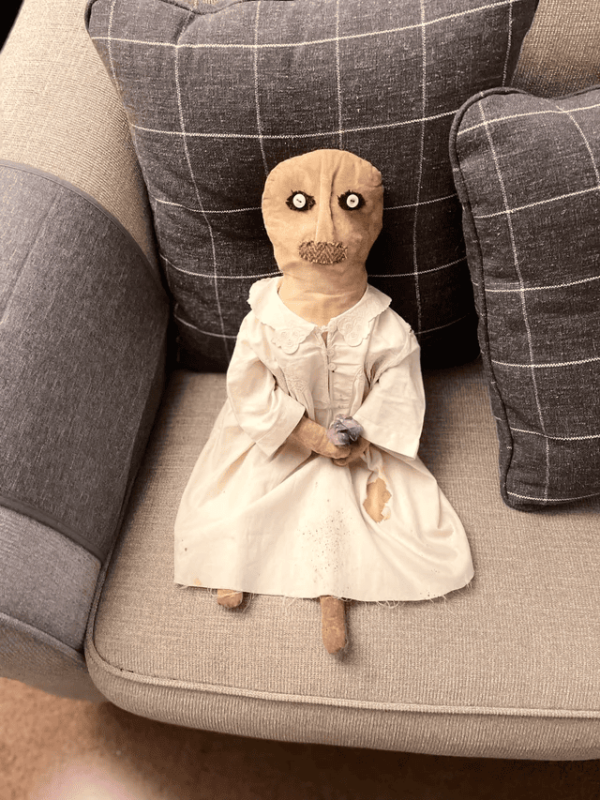 Это кукла ручной работы 19-го века. Досталась от прабабушки. Правда, держать ее дома совсем не хочется.